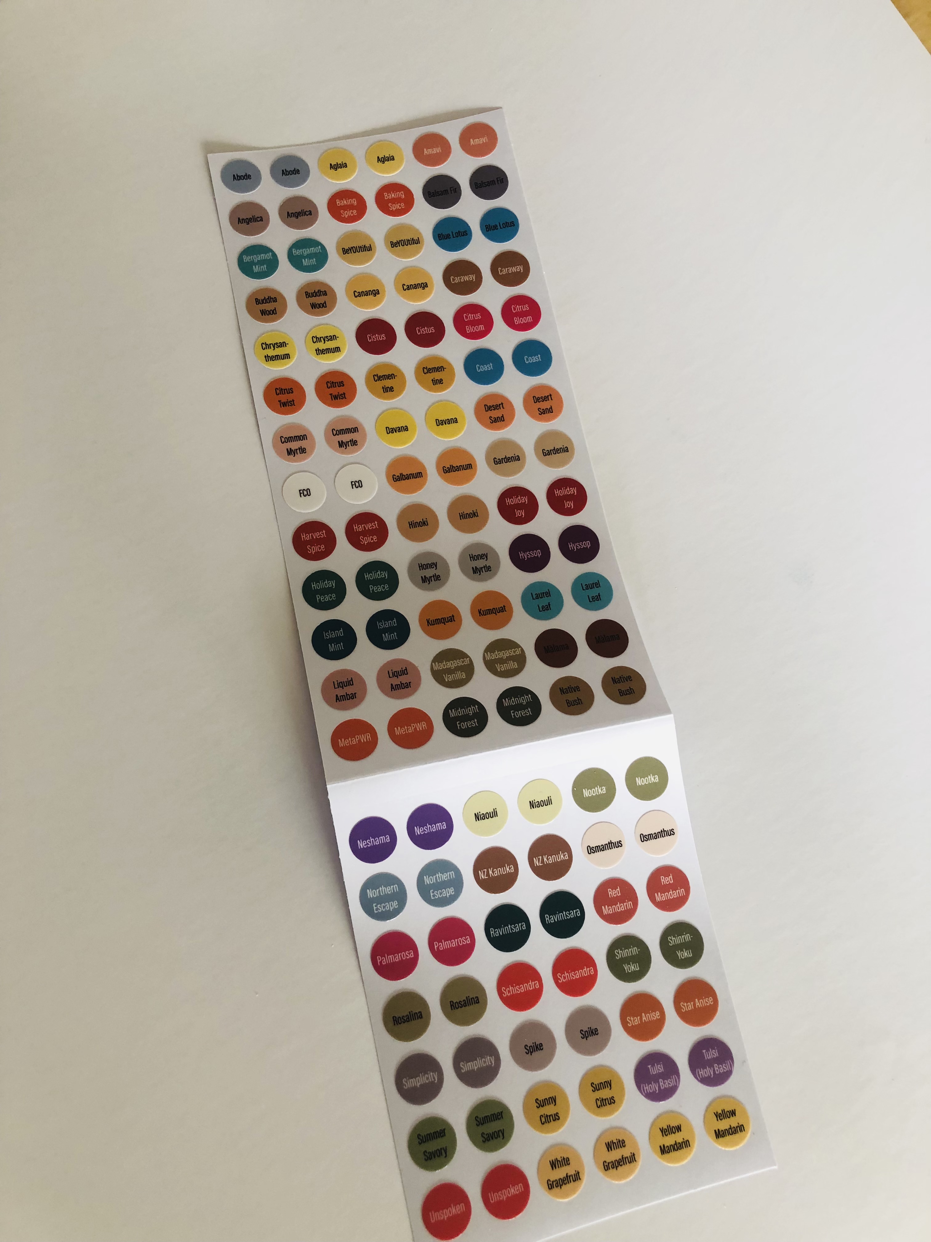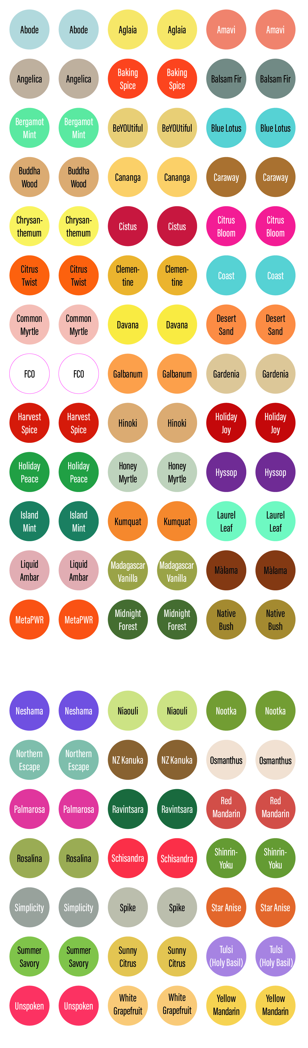Abode • Aglaia • Amavi • Angelica • Baking Spice • Balsam Fir • Bergamot Mint • BeYOUtiful • Blue Lotus • Buddha Wood • Cananga • Caraway • Chrysanthemum • Cistus • Citrus Bloom • Citrus Twist • Clementine • Coast • Common Myrtle • Davana • Desert Sand • FCO • Galbanum • Gardenia • Harvest Spice • Hinoki • Holiday Joy • Holiday Peace • Honey Myrtle • Hyssop • Island Mint • Kumquat • Laurel Leaf • Liquid Ambar • Madagascar Vanilla • Malama • MataPWR • Midnight Forest • Native Bush • Neshama • Niaouli • Nootka • Northern Escape • NZ Kanuka • Osmanthus • Palmarosa • Ravintsara • Red Mandarin • Rosalina • Schisandra • Shinrin-Yoku • Simplicity • Spike • Star Anise • Summer Savory • Sunny Citrus • Tulsi (Honey Basil) • Unspoken • White Grapefruit • Yellow Mandarin.